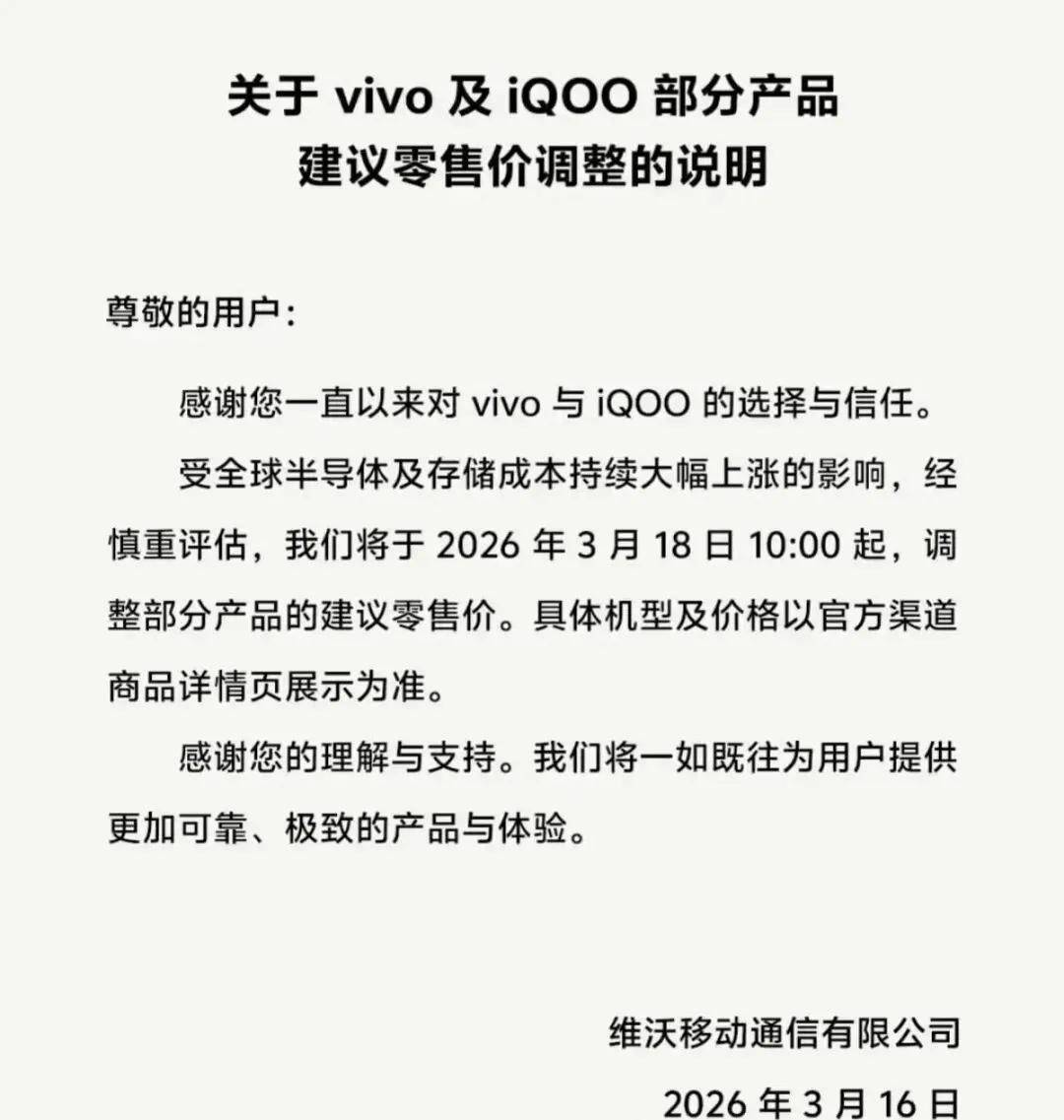 前几天,OPPO官宣主品牌和旗下的一加多款新老机型涨价,而今天这个公告已经正式执行了。同样是今天,vivo也官宣了主品牌和旗下iQOO多款机型的涨价通知,从3月18日起,调整部分产品的建议零售价。虽然vivo没有给出具体涨价的机型,但小智个人推测